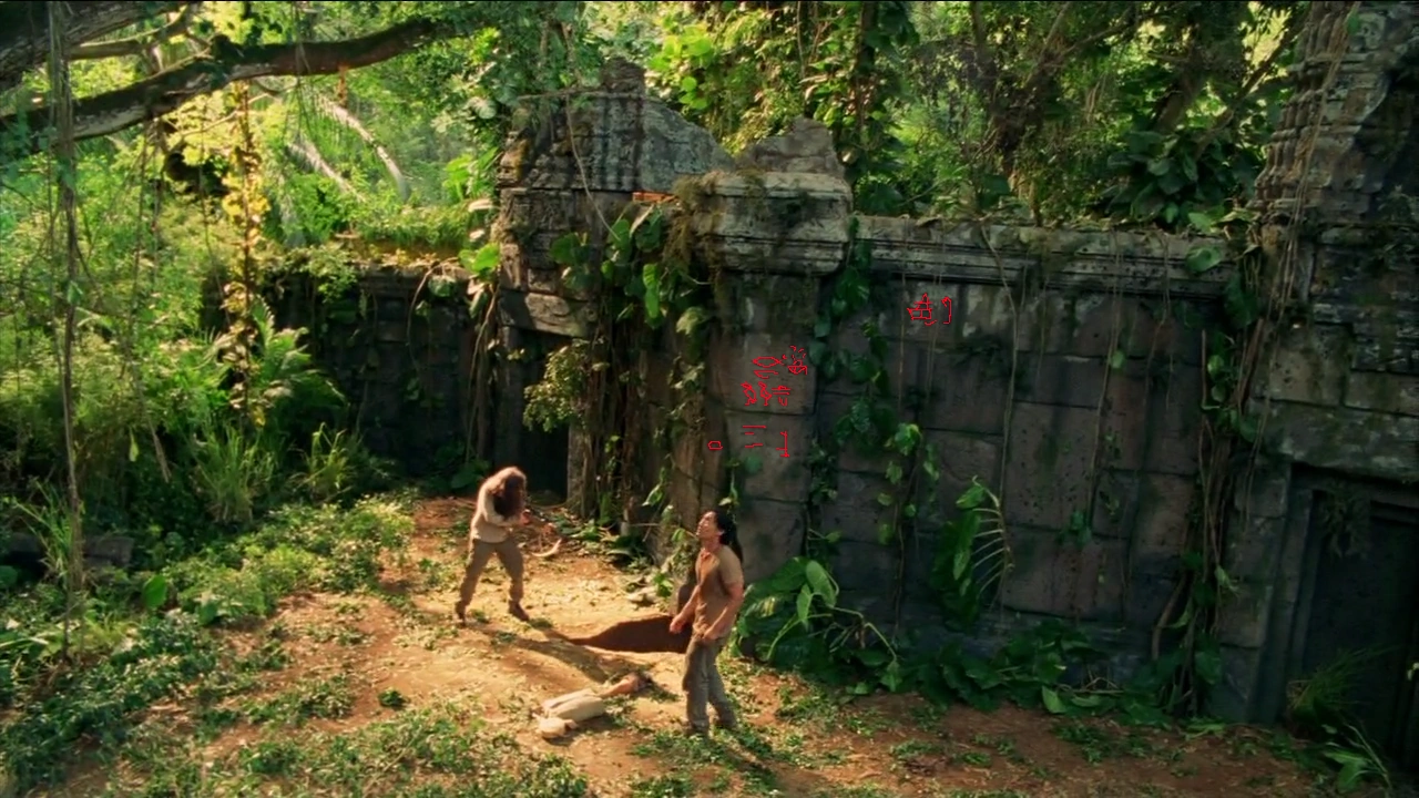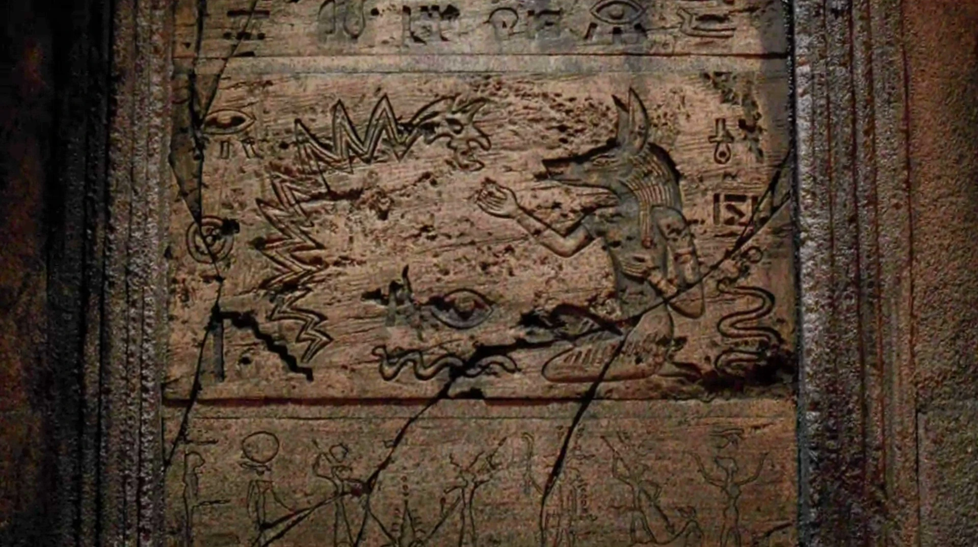 In der Episode „Tot ist tot“ geht Ben mit Locke in ein Loch unter dem Tempel. Bevor Ben eine Konfrontation mit dem Monster hat, ist eine Säule zu sehen, auf der Hieroglyphen und eine Darstellung von Anubis und dem Monster zu sehen ist.