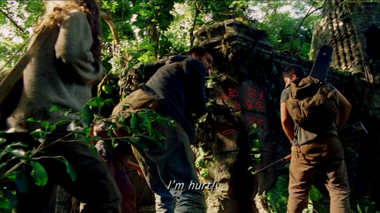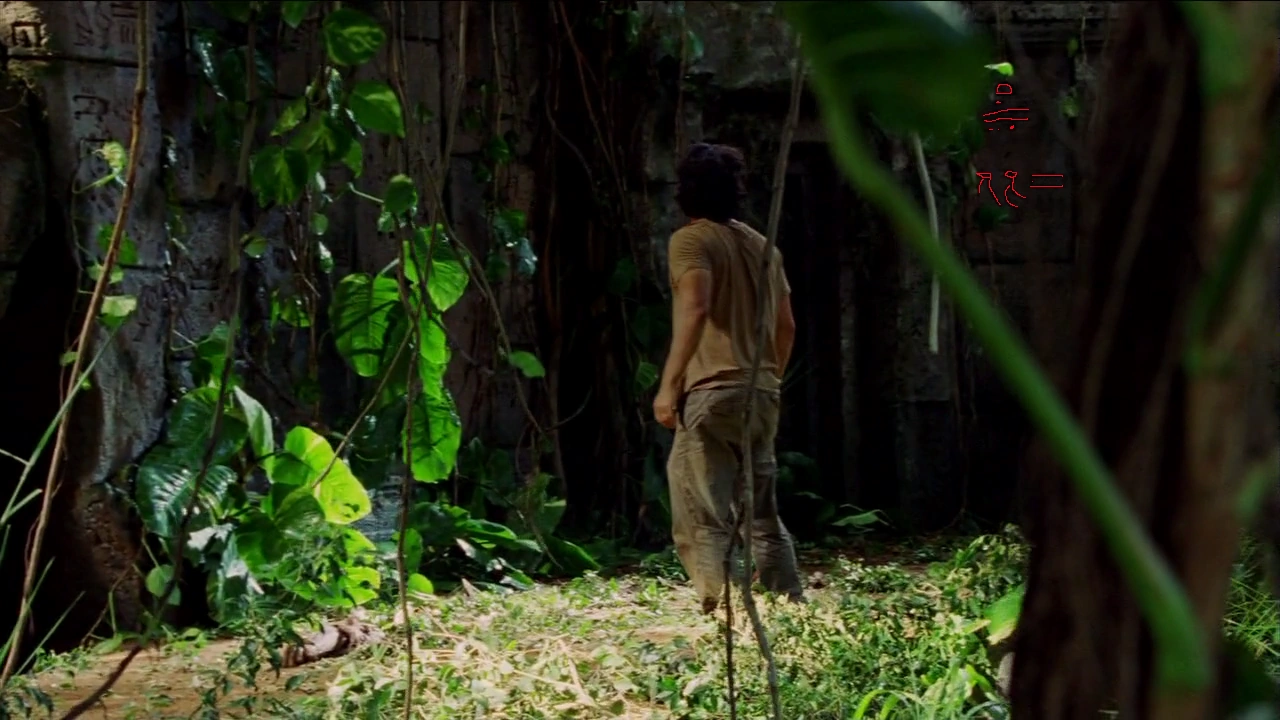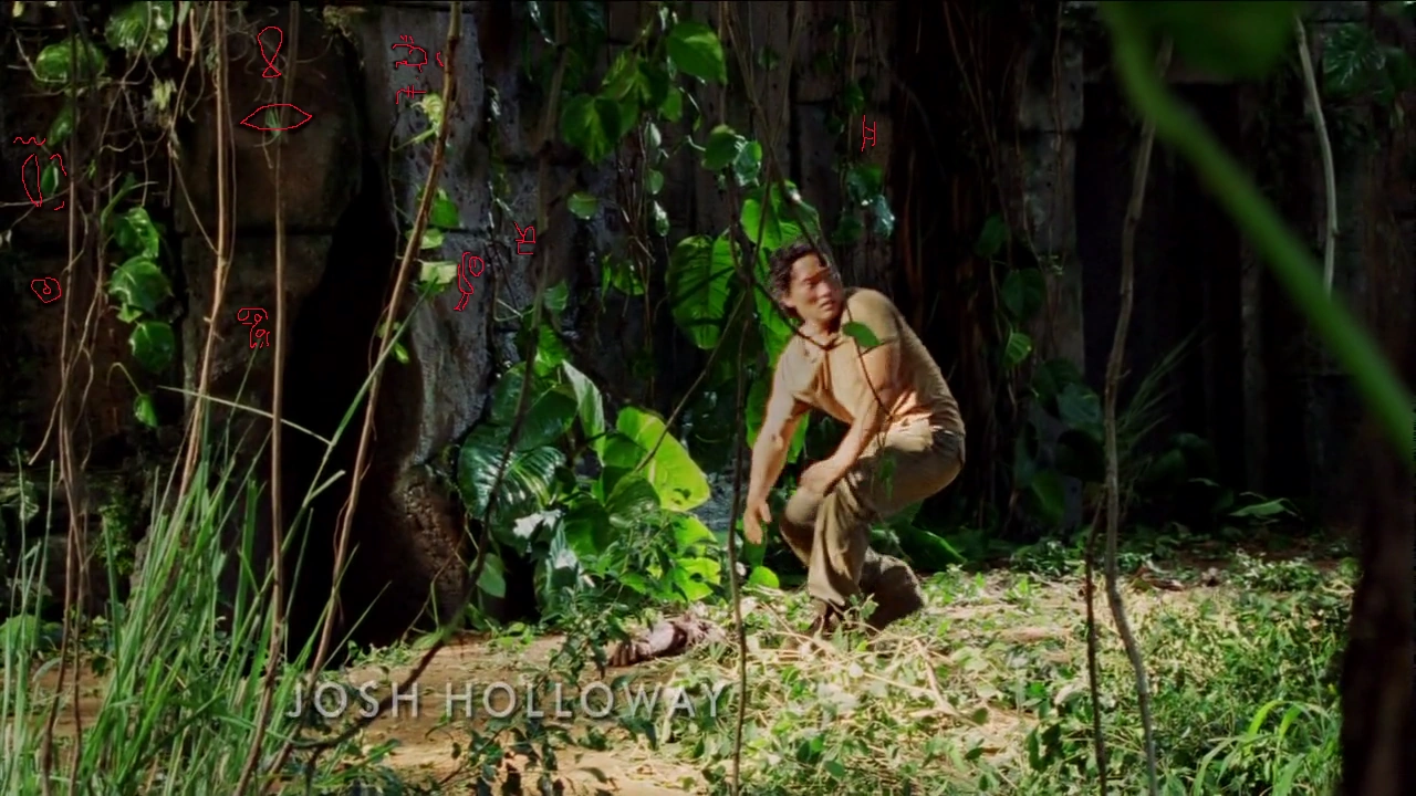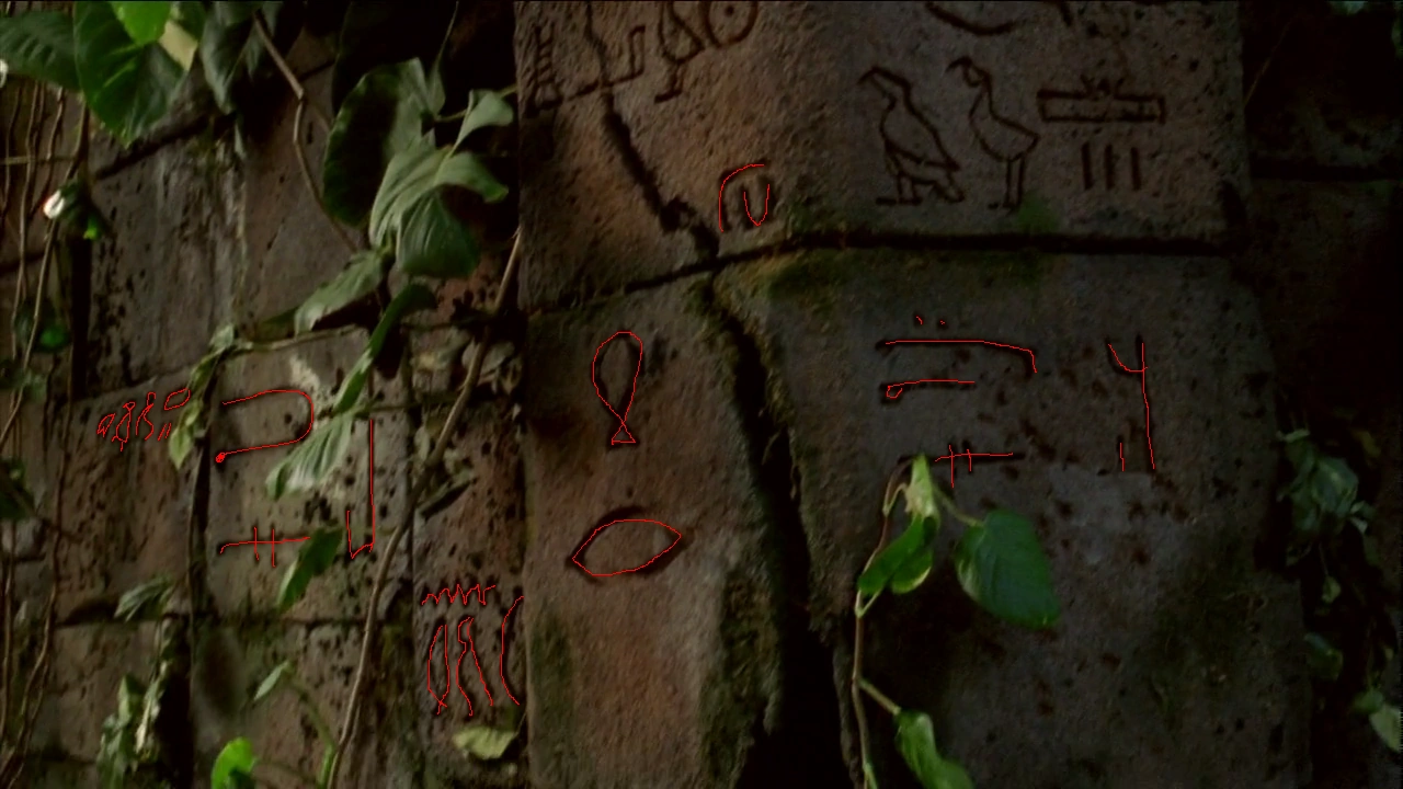 In der Episode „Der Leuchtturm“ hat Hurley sich Anweisungen von Jacob auf dem Arm geschrieben und durchsucht einen Gang im Tempel. Auch dort sind Hieroglyphen in den Wänden geritzt. Folgende Hieroglyphen sind zu sehen: