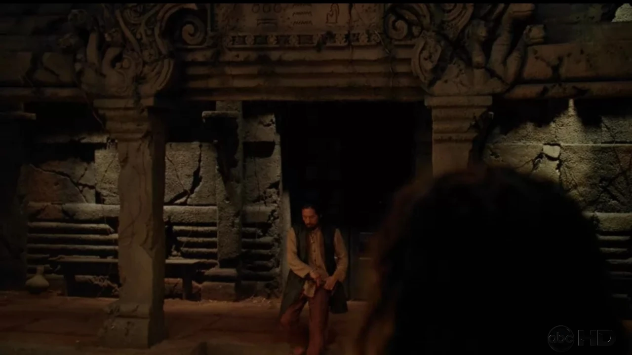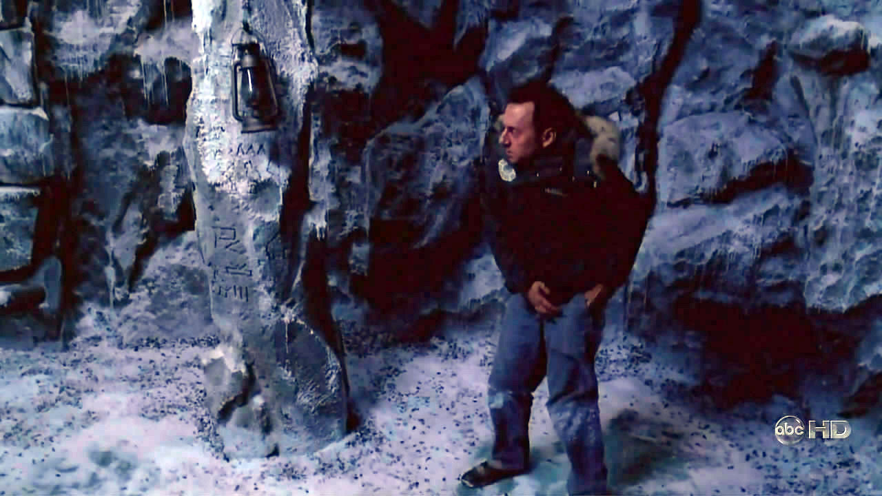 In der Episode „Der Anführer“ gehen Richard und Eloise mit Jack und Sayid in die Tunnel, wo die Wasserstoffbombe versteckt ist. In den Tunneln sind mehrere Säulen, auf denen Hieroglyphen zu sehen sind. Einige der Hieroglyphen sind allerdings invertiert oder auf dem Kopf gestellt. Diese Zeichen laufen auf der Säule von oben nach unten: