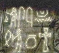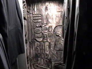 In der Mitte sind auch zwei Reihen mit Hieroglyphen zu sehen. Es scheinen einige davon invertiert oder umgedreht worden sein. Sie weisen Ähnlickeiten mit denen in den Tunneln auf.
