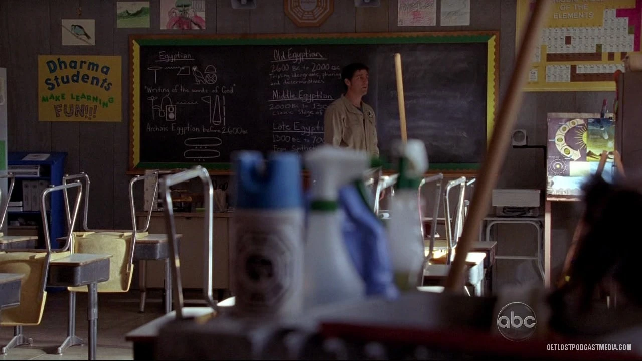 In der Episode „Das Imperium schlägt zurück“ sind auf einer Tafel in der DHARMA-Schule auch Hieroglyphen zu sehen. Darunter eine Erklärung. Die erste Reihe meint "Ägyptische Sprache" . Das zweite übersetzt "Mit den Worten Gottes schreiben". Die dritte Reihe heisst "Ägypten".