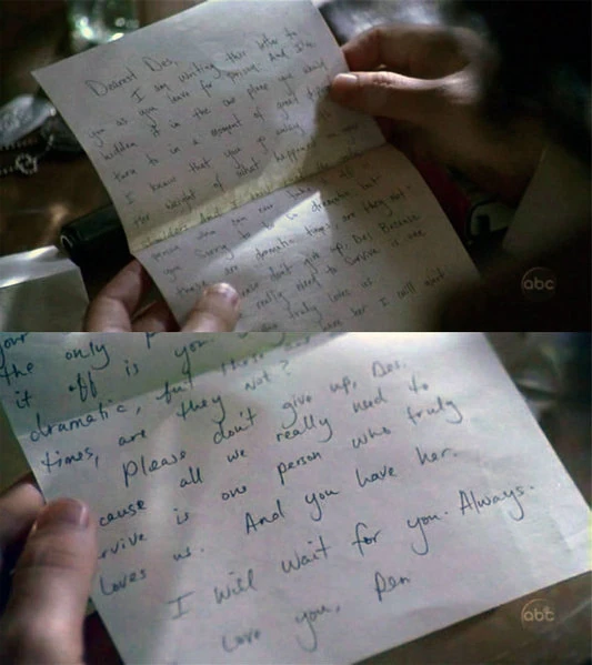 Liebster Des, ich schreibe dir diesen Brief in dem Augenblick deiner Abreise ins Gefängnis und ich verstecke ihn dort, wo du ihn im Moment größter Verzweiflung finden wirst. Ich weiß, dass das, was geschehen ist, schwer auf deinen Schultern lastet und ich weiß auch, dass der einzige, der dich davon befreien kann, du selbst bist. Bitte gib nicht auf, Des, denn das einzige, was wir zum Überleben brauchen, ist ein Mensch, der uns wirklich liebt. Und du hast diesen Menschen. Ich werde auf dich warten. Immer. Ich liebe dich, Pen |