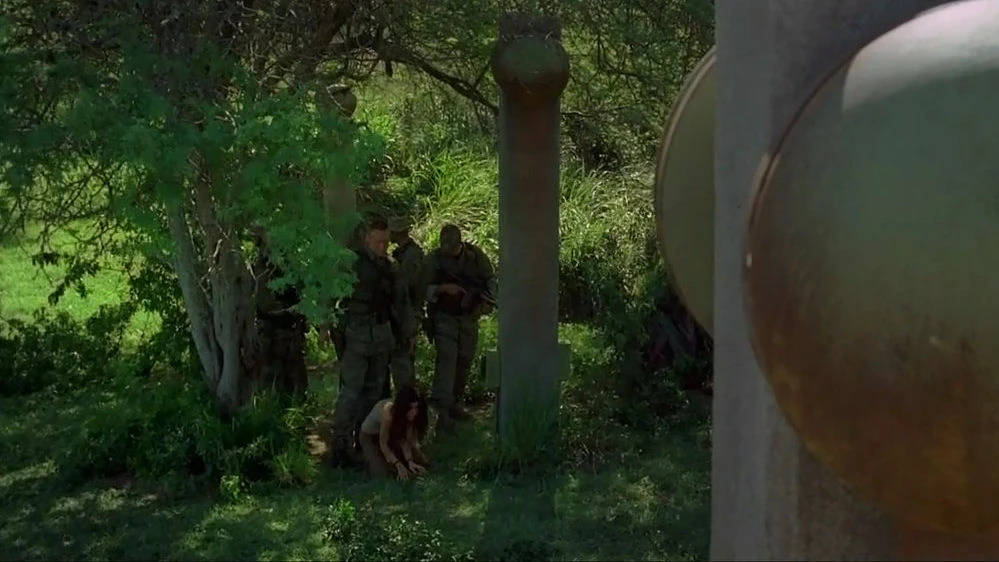 Am Sonarzaun angekommen zwingt Keamy Alex dazu, den Zaun zu deaktivieren. Alex gibt die Zahlen 1623 ein und aktiviert so den Code 14J. Während Kaemy und seine Leute nichts ahnen, weiß Ben nun vom bevor stehenden Angriff und verschanzt sich in seinem Haus. Als der Trupp die Baracken erreicht, sehen sie Sawyer, wie er mit Doug redet. Sie eröffnen das Feuer und töten Doug, eine Frau und Jerome. Des Weiteren feuern sie eine Rakete auf Claires Haus, wobei Claire zwar verletzt wird, aber kurz danach von Sawyer in Sicherheit gebracht werden kann. Daraufhin stellt der Trupp das Feuer ein. Keamy lässt Miles holen und schickt ihn mit einem Funkgerät in Bens Haus. Keamy spricht mit Ben und droht damit Alex zu erschießen, wenn er nicht heraus käme. Als Ben sich weigert, tötet Keamy "seine Tochter". Ben ruft darauf hin das Monster, welches den Trupp angreift. Keamy befiehlt seinen Leuten sich zurück zu ziehen. Einer seiner Männer versucht in Richtung von Bens Haus zu flüchten, er wird jedoch vom Monster wieder zurück in den Dschungel gezogen. („Konturen der Zukunft“)