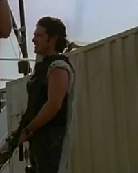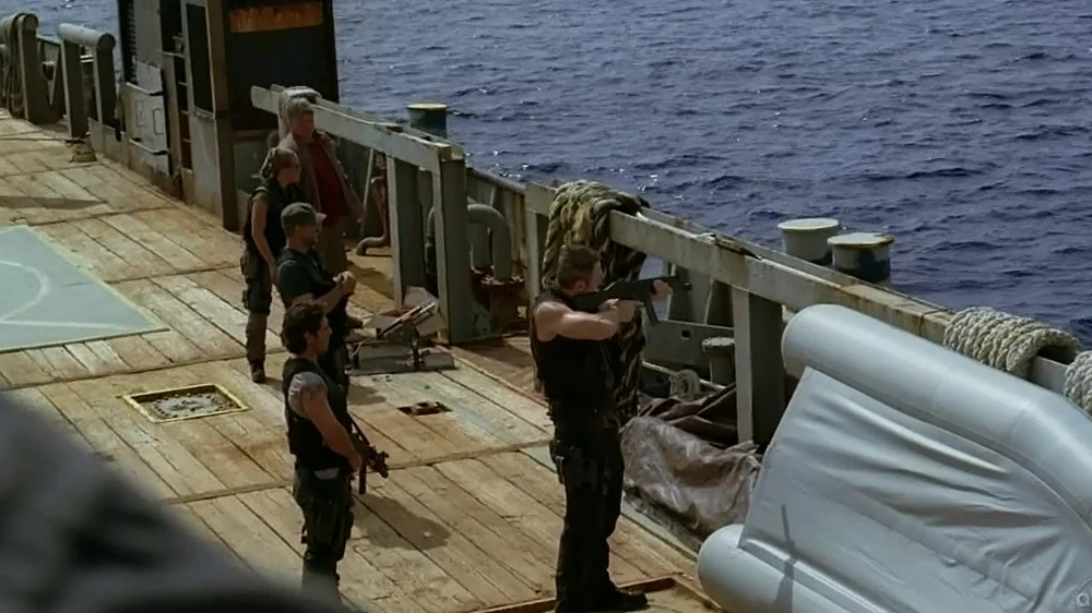 Auf dem Frachtschiff, macht ein Teil des Teams Schießübungen. Der dickere Mann scheint dabei nicht zum Team zu gehören, und schaut den anderen wahrscheinlich nur zu.