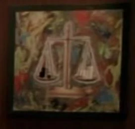 A painting of balanced scales in Widmore's office
