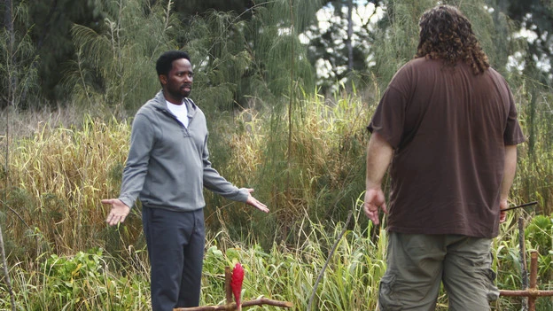 Hurley evita per poco di essere impalato da Locke. ("Ulteriori istruzioni")