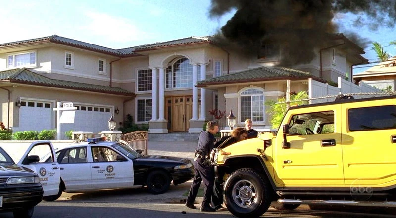 La casa appena acquistata da Hurley in fiamme, mentre la polizia lo arresta. ("Numeri")