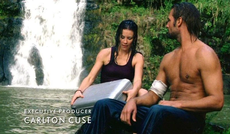 Sawyer si toglie allora la maglietta e si butta in acqua, incoraggiando Kate a seguirlo. Kate entra allora in acqua e, assieme a Sawyer, si dirige verso la cascata, arrampicandosi poi sulle rocce e rituffandosi in acqua. Mentre sono sott’acqua e scherzano fra di loro, però, i due notano sul fondo del lago due cadaveri ancora attaccati ai sedili dell'aereo. Quando tornano in superficie Sawyer decide di immergersi nuovamente in acqua per vedere se fra gli averi dei passeggeri c'è ancora qualcosa di utile e Kate, disgustata dall’idea di depredare dei cadaveri, lo segue per fermarlo. Arrivata vicino ai corpi, però, la ragazza nota una valigetta Halliburton infilata sotto uno dei sedili. Kate e Sawyer allora riemergono e Kate chiede a Sawyer di aiutarla a prendere la valigetta, affermando che le appartiene. I due si immergono allora un’altra volta e Sawyer recupera la valigetta con un po' di fatica, porgendola poi a Kate.